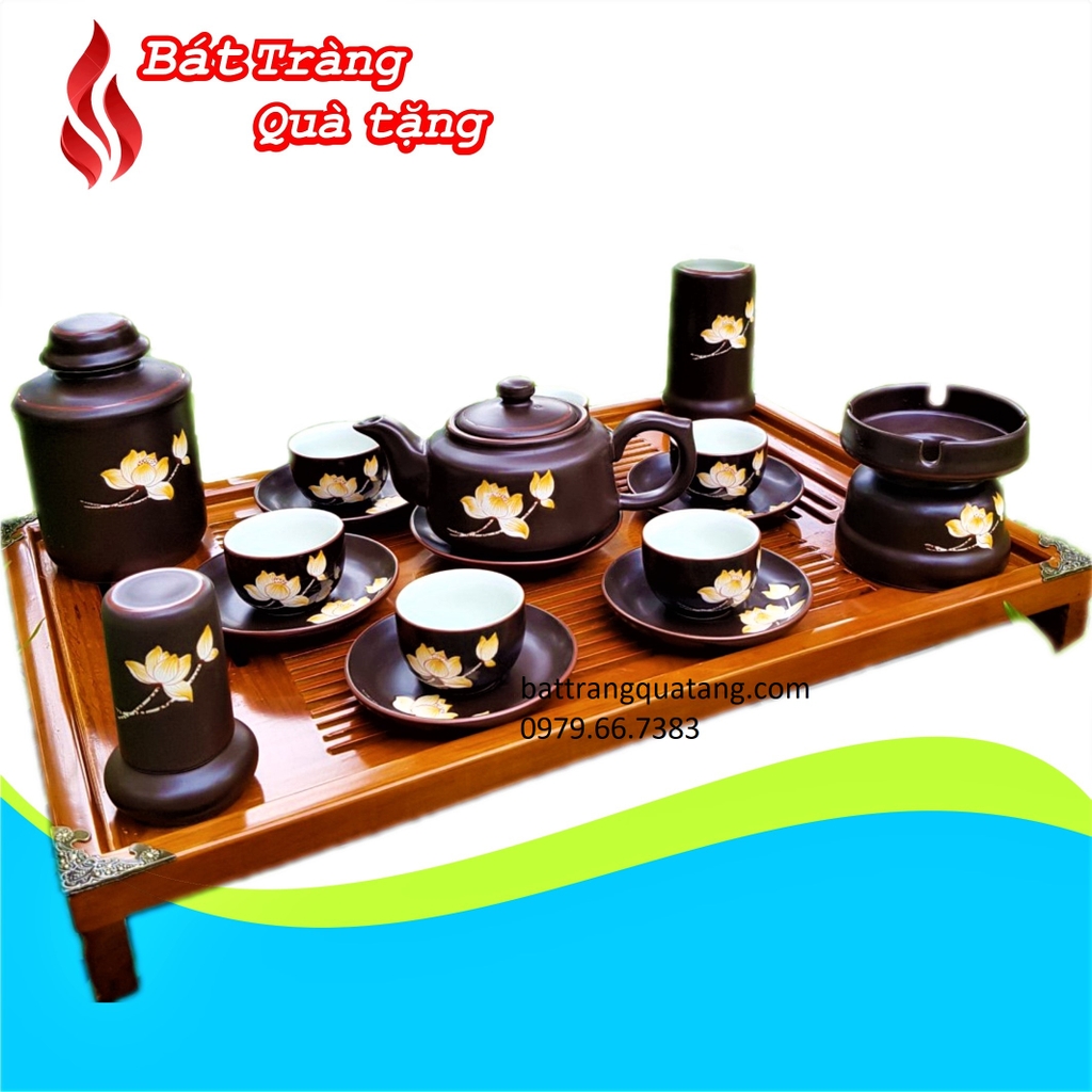 Bộ ấm chén dáng bầu vuông vẽ hoa sen đầy đủ phụ kiện