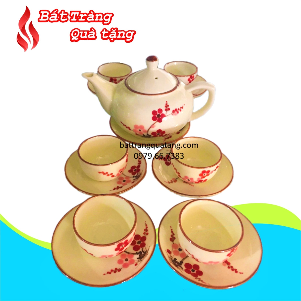 Tên sản phẩm: Bộ ấm chén hoa đào men kem dáng dẹt